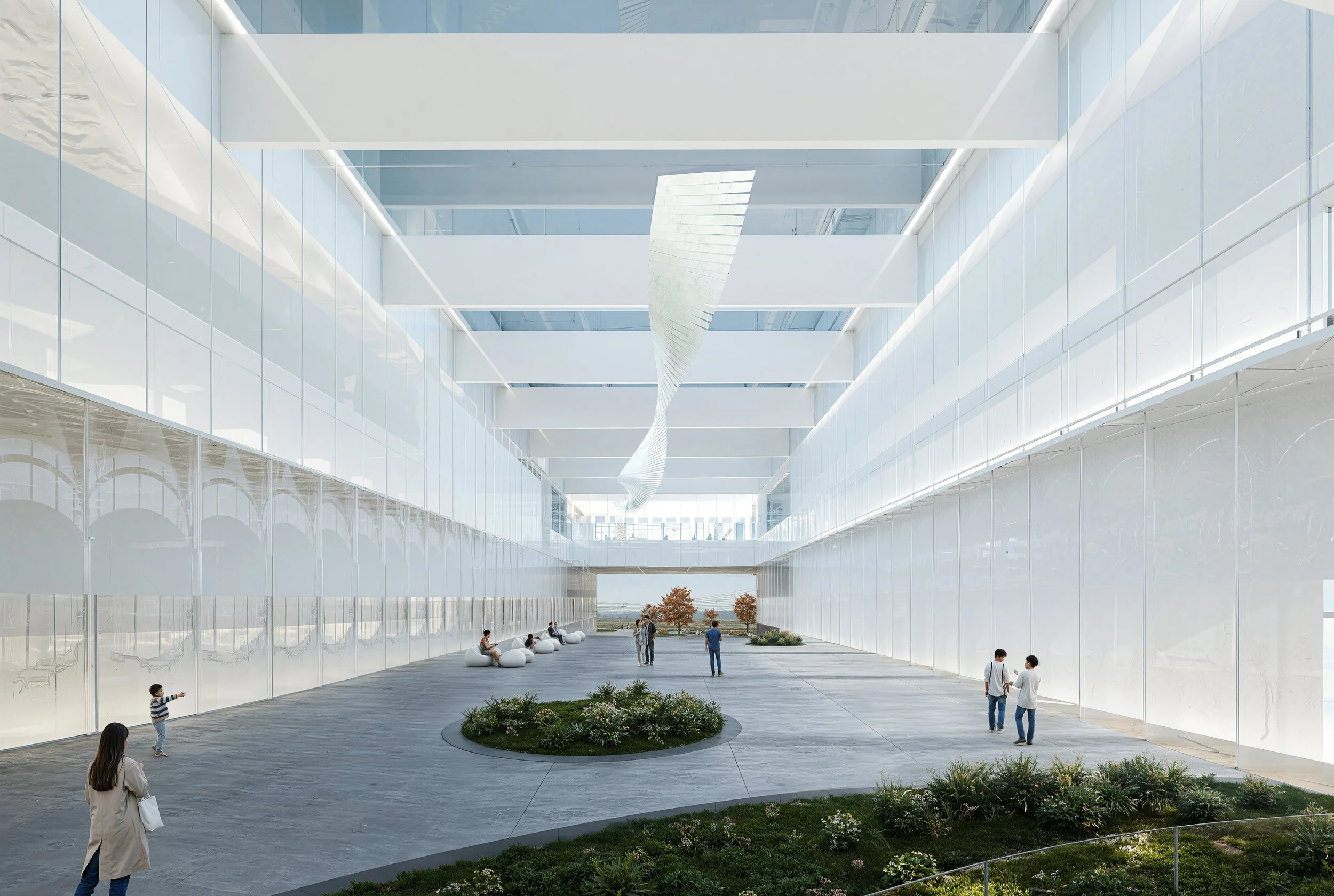 충북아트센터는 단순한 공연시설이 아니라 중부권 문화축의 정점이자 도립 공연문화의 대표 플랫폼으로 선언된다. 우리는 공원의 흐름이 대지 안으로 단절 없이 스며들도록 열어두고, 그 위로 하나의 Curved Plate를 띄움으로써 도시적 스케일의 지붕 아래에 다층의 문화활동이 늘 머무를 수 있는 그늘과 공백을 마련하였다. 이 Plate의 하부는 비어 있으나 죽어 있지 않은 층 - 행사와 무관하게 사람들이 서고, 걷고, 머무르며 도시가 스스로 점유하는 층으로 작동한다.