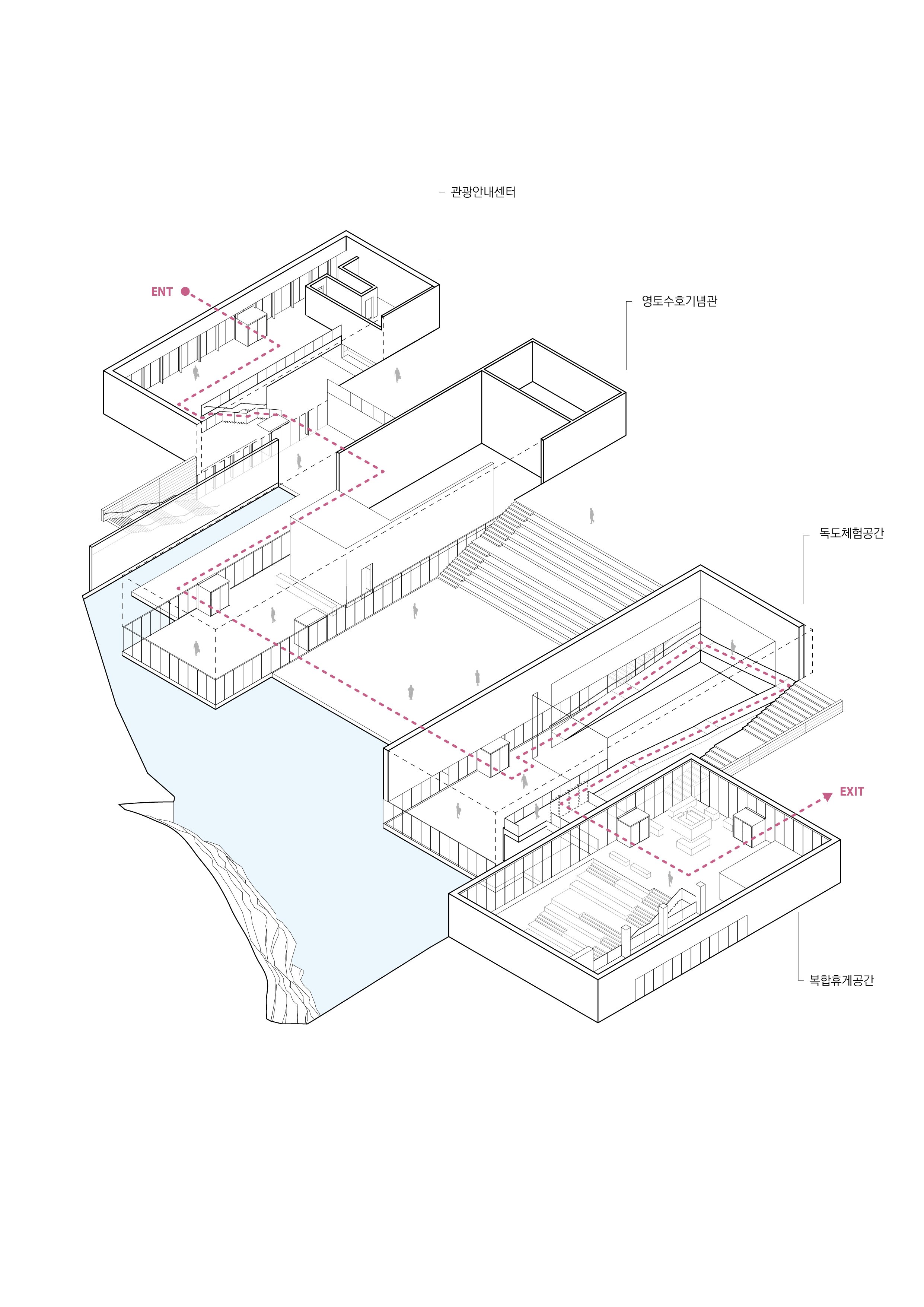 건물은 관광안내센터, 영토수호기념관, 독도체험공간, 복합휴게공간 총 4개의 동으로 구성되어 있다. 사람들은 하나의 통합된 공간에서 전시를 관람하는 것이 아닌, 분절된 4개의 동을 이동해가며 전시를 관람하게 된다. 각 건물들 사이에는 대상지 본연의 자연경관을 드러내는 외부 공간들이 채워지고 연결되며 건축과 조경이 조화를 이루게 된다. 관광안내센터에서 시작되어 영토수호기념관, 독도체험공간, 복합휴게공간에 이르기까지, 이사부독도기념관 방문객들의 순차적인 경험은 건축 레벨의 연속적인 변화와 실내외 공간의 교차를 통해 이루어지며, 이러한 건축적 산책은 풍부한 경험을 제공한다.