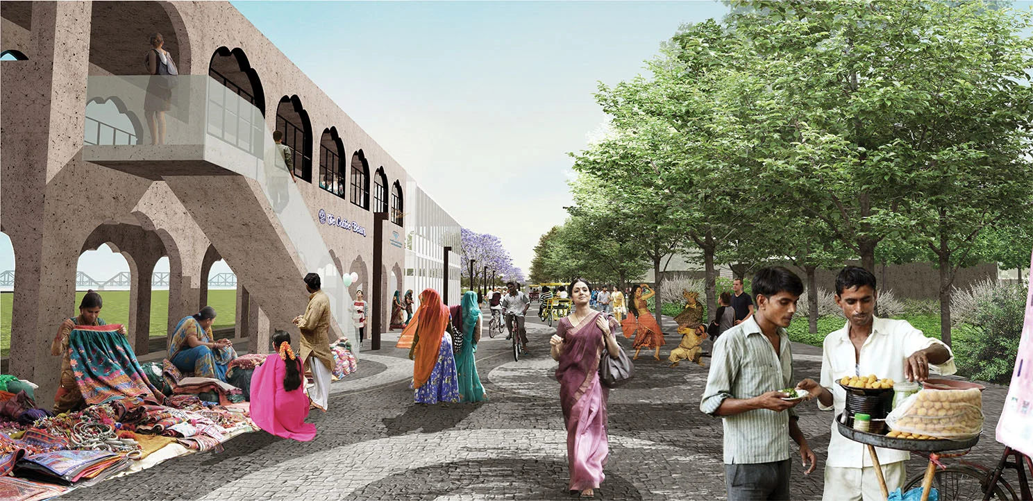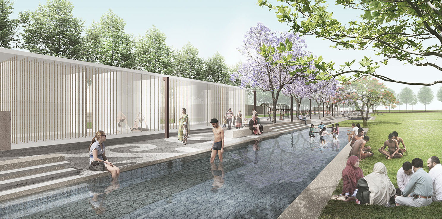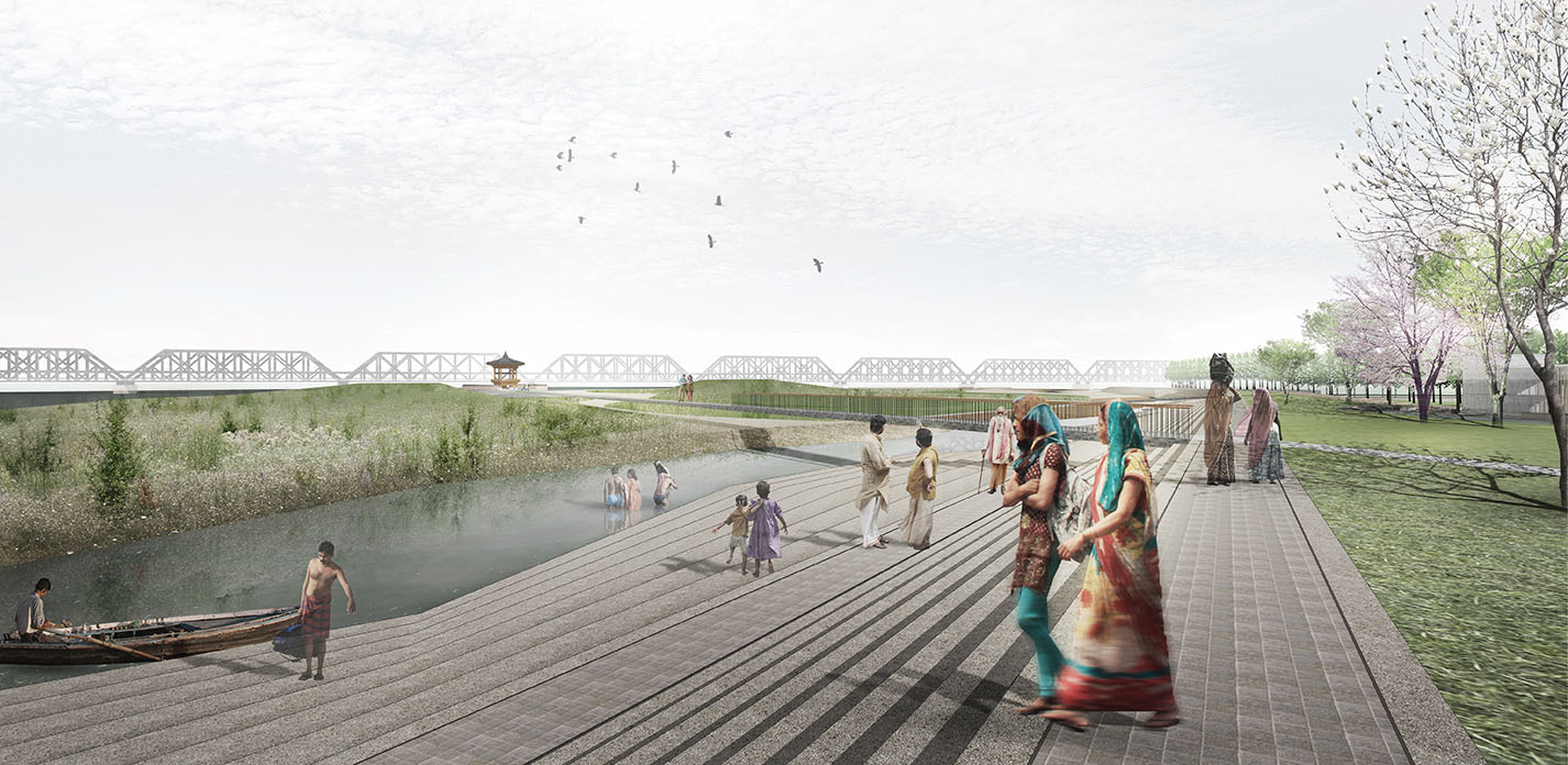 First, we translocate the existing Ghat which decouples the town from Sarayu River. Rearrangement of V-shaped Ghat makes gently sloped site. And a plaza in the center of reorganized site becomes facing the Sarayu River. Furthermore, a well-appointed street, paralleled to the axis of the surrounding urban tissue, induces citizens to have the close connection with the city and natural flow.