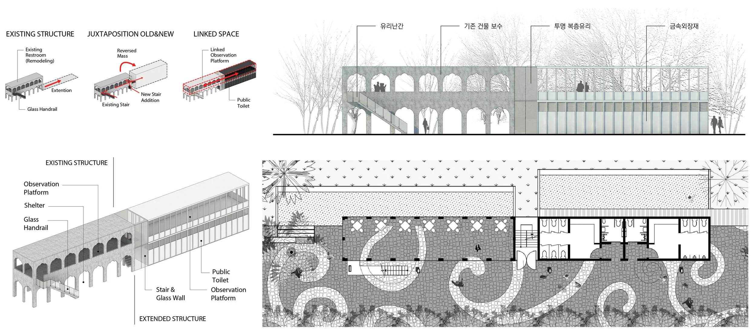 The existing restroom, which is located on the west side of the site, was constructed with a simple structure of two stories and had an opening design of Mogul architecture style. It was provided as a shelter and rest space for local residents. We suggest renewal such a lagging building due to its architectural potential. new programs are juxtaposed and expanded. On the first floor, a public restroom and administrative office, which is the essential facility for management of the park, was installed. On the second floor, a linear observation deck will be used to view the surroundings such as Sarayu River and daily life. It reflects a general tradition of Korean pavilions. Two buildings, which have the same volume and form, are closely ties by a transparent staircase in between, but facade, structure, and spatial systems definitely make a distinction. It is designed to reveal the difference and harmony between the old and new.