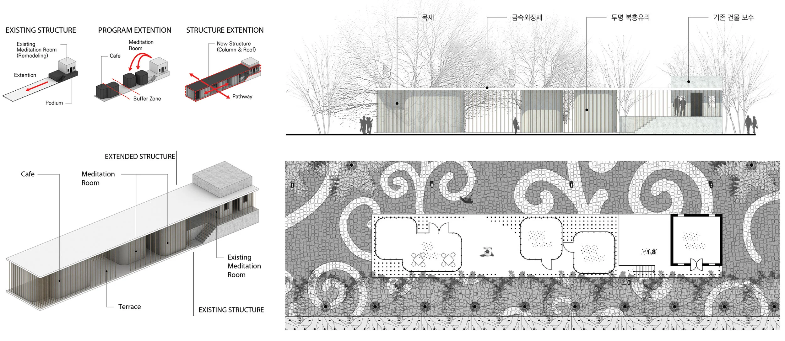 On the existing GHAT, there is a meditation room on the east side of the site. It is used by many locals for a space of worship. It might be not have a much values in terms of building itself. However, it should be dealt as a symbolic building that shows the life of the city. We put an effort to preserve and reproduce the invisible value. A podium was installed to overcome the difference in level with the newly established street. In addition, contemporary reinterpreted meditation places were further arranged in parallel for reinforcing religious programs. Resting spaces and cafes are newly created as healing and resting spaces in daily life. The metal columns as a slender frame lightly support the plat roof, and the inner space is divided by the transparent glass to maximize the visual openness and contrast with the conventional meditation placed side by side.